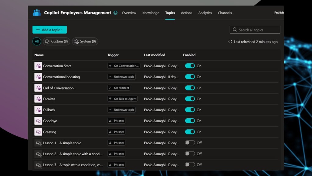 Topics are the fundamental components that define how a conversation with Copilot unfolds. Each Topic represents a specific conversation path that, when combined with others, allows for natural and fluid dialogues.