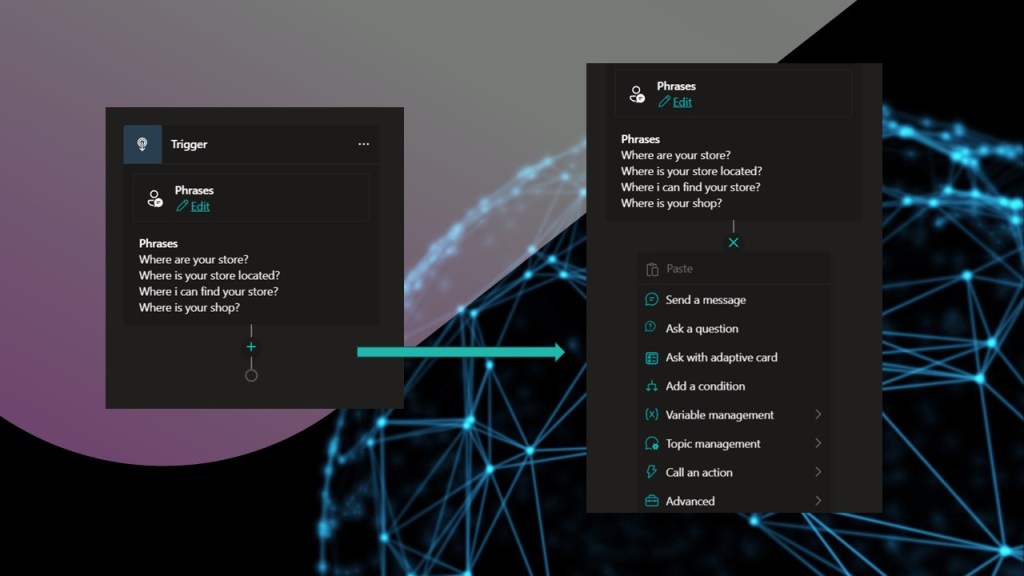 For example, I decide to design something that responds to queries about the stores of a particular chain and provides addresses. I click on “Add Topics,” decide on a name, and by clicking on the trigger, I enter the activation phrases.