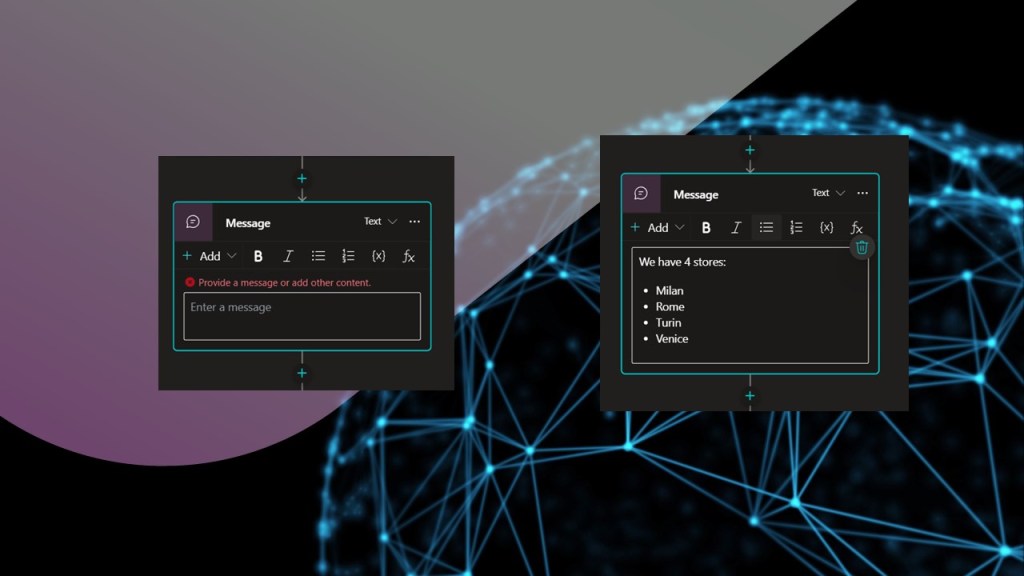 By clicking on “Send a message,” a new action appears. We can decide whether to insert simple text, images, videos, cards, and much more.