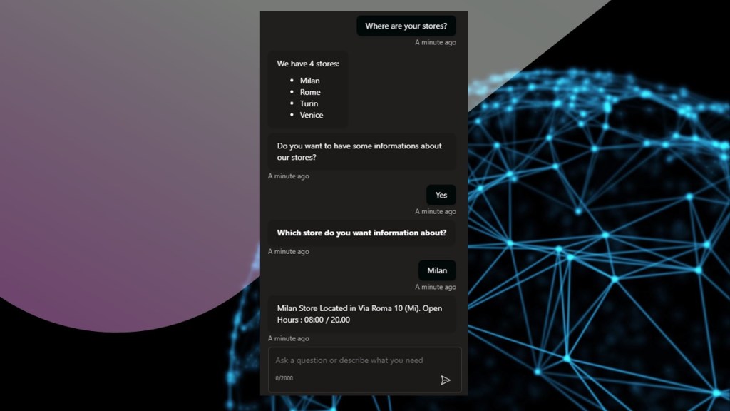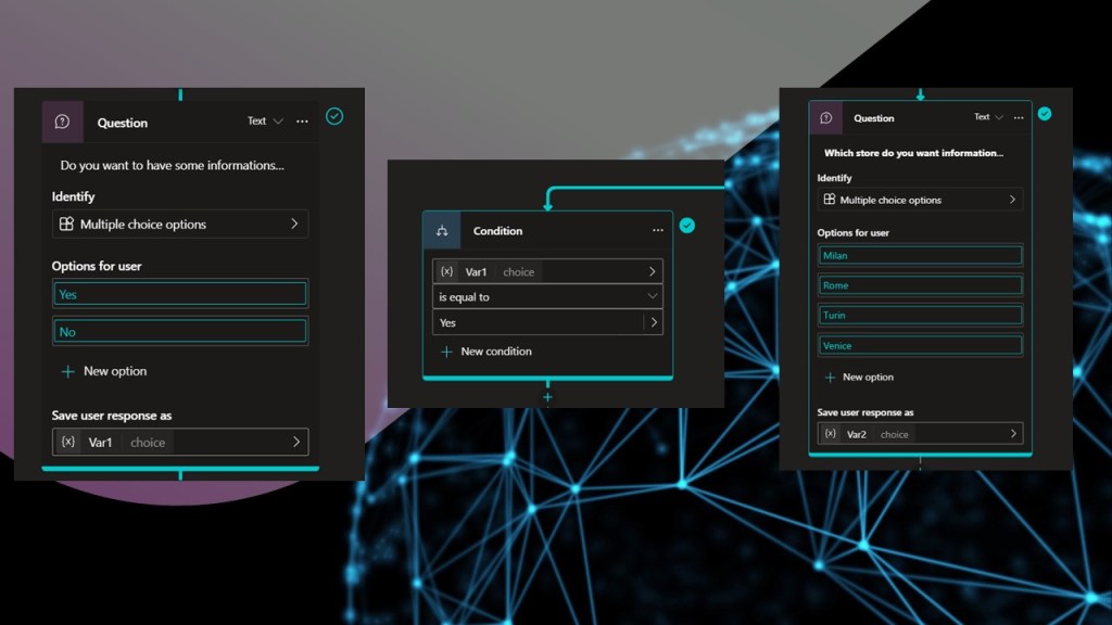 Following this method, we can obviously go further, for example, by asking the user (through the “Ask a question” action) if they would like to receive information about the stores and inserting a simple condition to the question:
