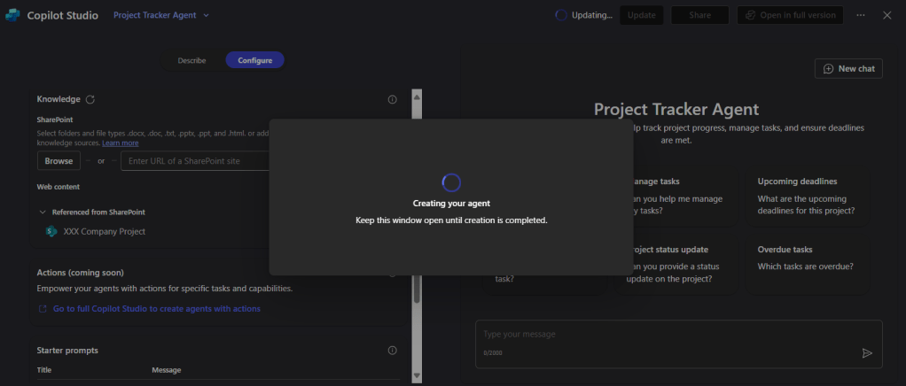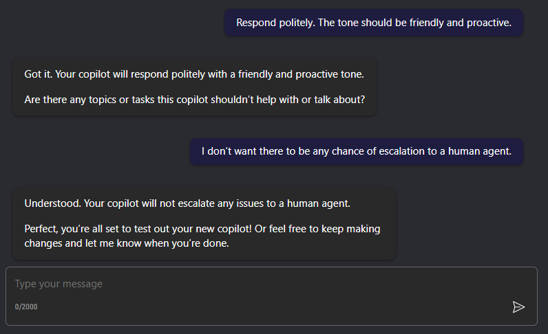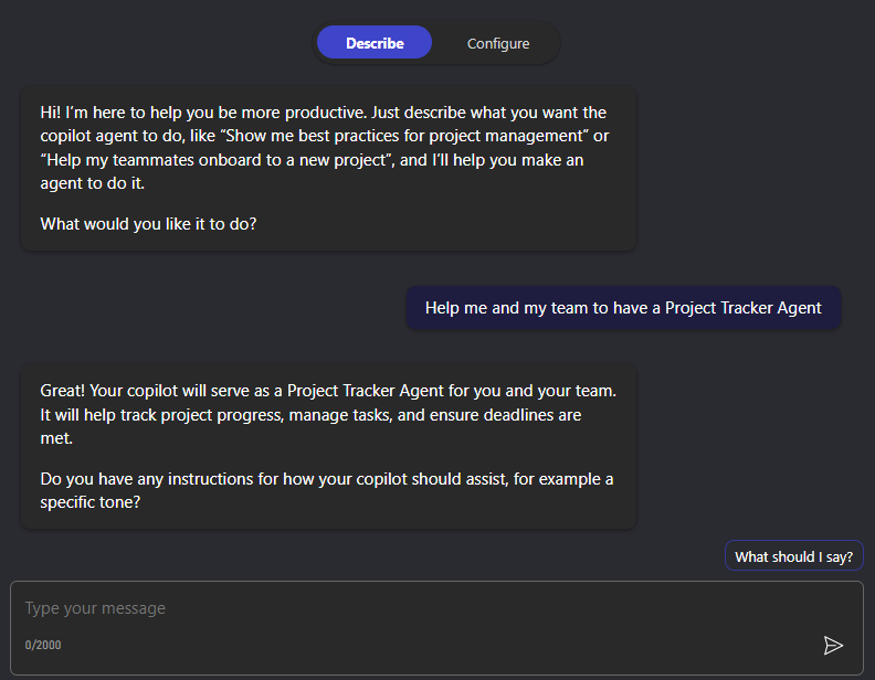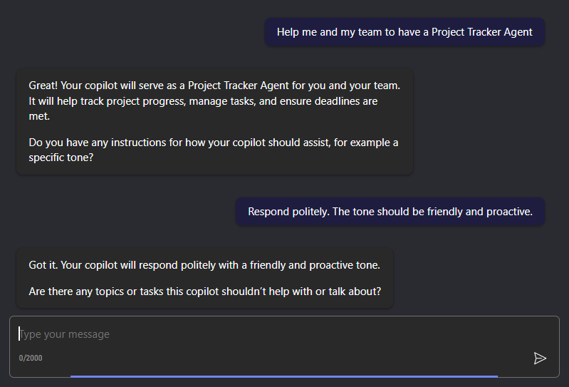 Let’s imagine this screen as a development wizard where we are assisted by Copilot asking us for information to create the agent. I then insert the following prompt