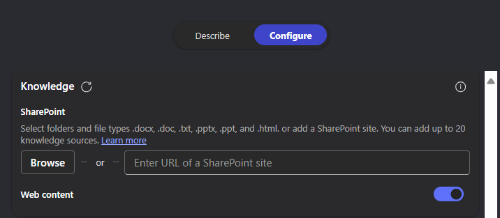 I previously created an analysis document and deposited it in a SharePoint folder, which I will now upload to the agent’s Knowledge.