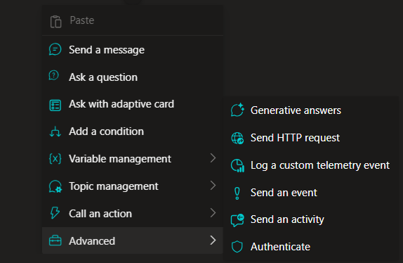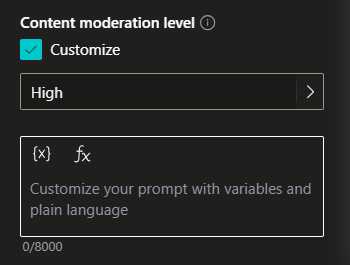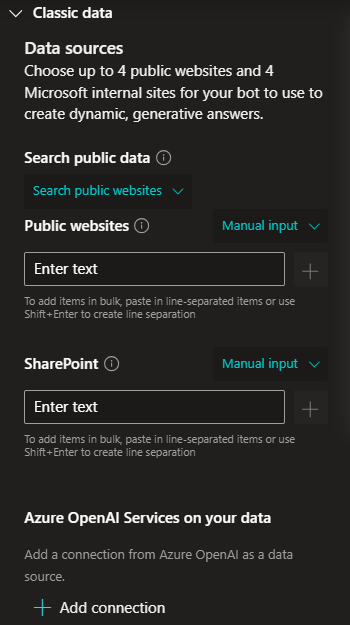 This is the setting that allows us to insert Public websites, SharePoint, or even Azure OpenAI Services. Within the node, we have another level of customization.