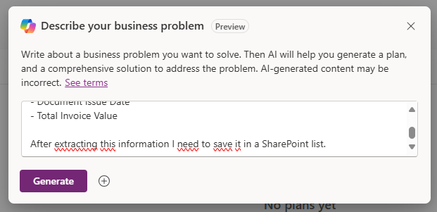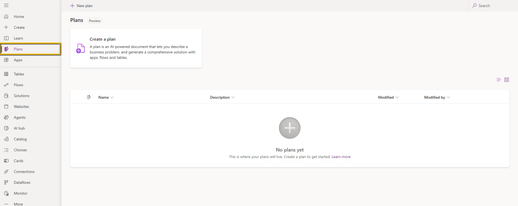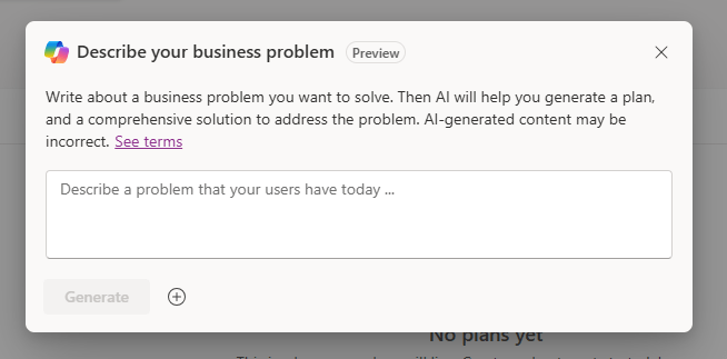 The official description is “A plan is an AI-based document that allows you to describe a business problem and generate a complete solution with apps, flows, and tables.”