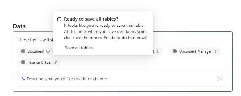 I have to save all the tables first. So I click on the first one and the following popup appears.