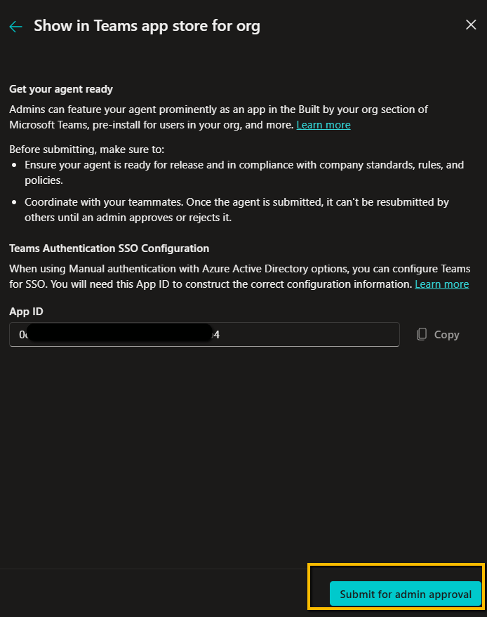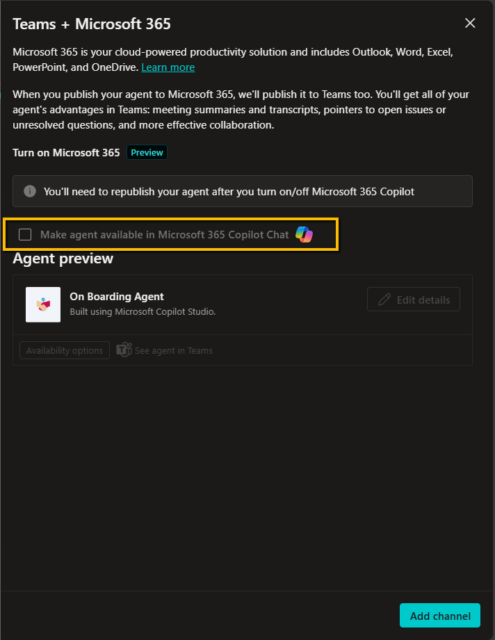 If you want to make the agent available on both platforms, select “Make agent available in Microsoft 365 Copilot chat”