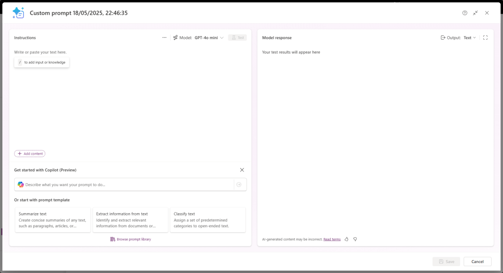 Accessing Power Apps, select AI Hub, and finally go to the Prompts section.