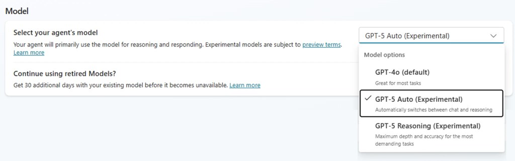 Certainly, what impressed me most is that in Copilot Studio we can now choose GPT-5 Auto: the agent will use GPT-5’s real-time router to select the right model—either the high-performance GPT-5 model or the deep reasoning model—allowing the agent to autonomously find the right balance between speed and planning.
