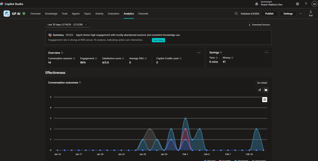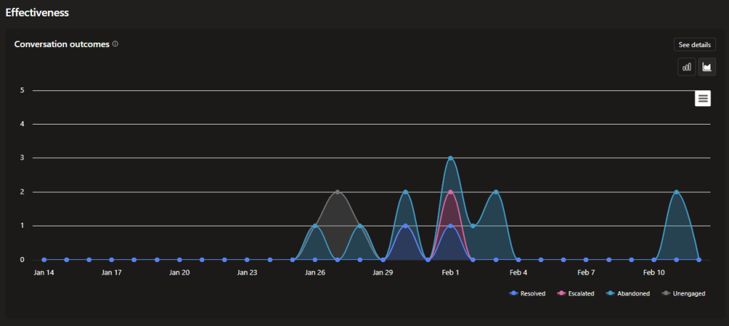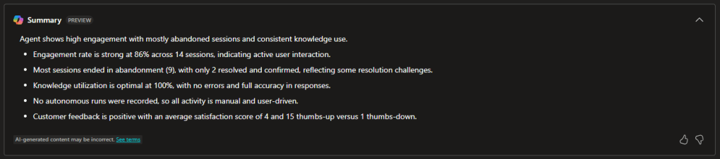 Here, you will find “Generated answer rate and quality”. Although still in preview, it is an essential analytics tool because it tracks the agent’s performance in answering users’ questions.