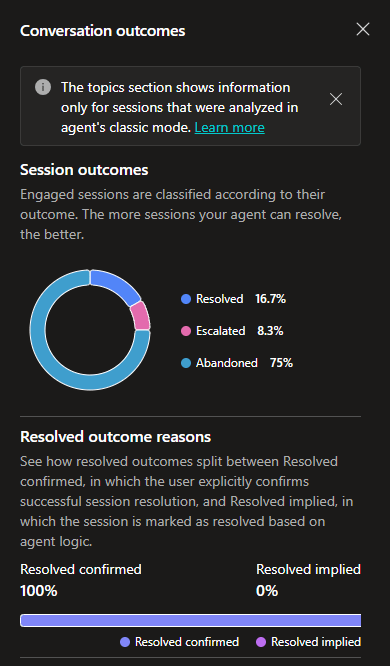 Let me focus on one aspect. Resolved outcomes are divided between “Confirmed resolved”, where the user explicitly confirms the resolution, and “Implicit resolved”, where the session is marked as resolved according to the agent’s logic.